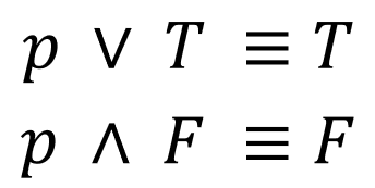 어떤 명제 p를 항상 참인 T와 논리합 연산을 할 경우 T가 이미 참으로 p의 값과 상관없이 항상 참이 된다.