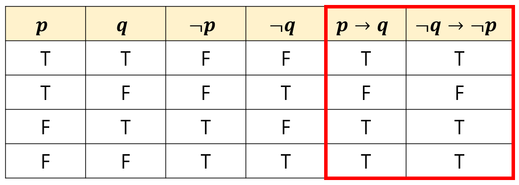 실제 진리표를 작성해본다면 p→q와 그 대우인 ¬q → ¬p의 진리표 값이 같음을 알 수 있다.